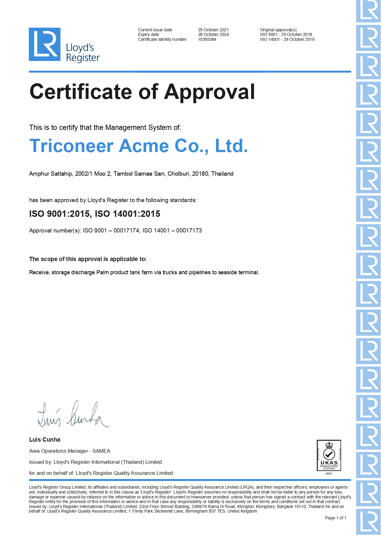 Triconeer Acme’s tank terminal received management system standard approval from international